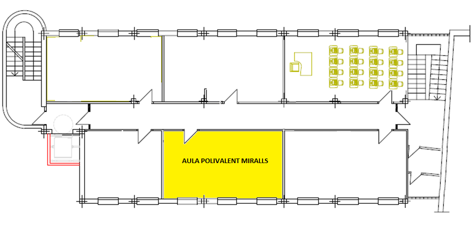 L’aula polivalent amb miralls de l’espai jove Kesse esta ubicada a la segona planta de l’edifici. Principalment aquesta aula es cedeix als usuaris per a que puguin assajar balls/coreografies, fer classes de zumba i/o aeròbic ja que una de les parets de l’aula són tot miralls i a l’hora de ballar pots corregir millor els errors i seguir al professor. El terra de l’aula és de parquet.